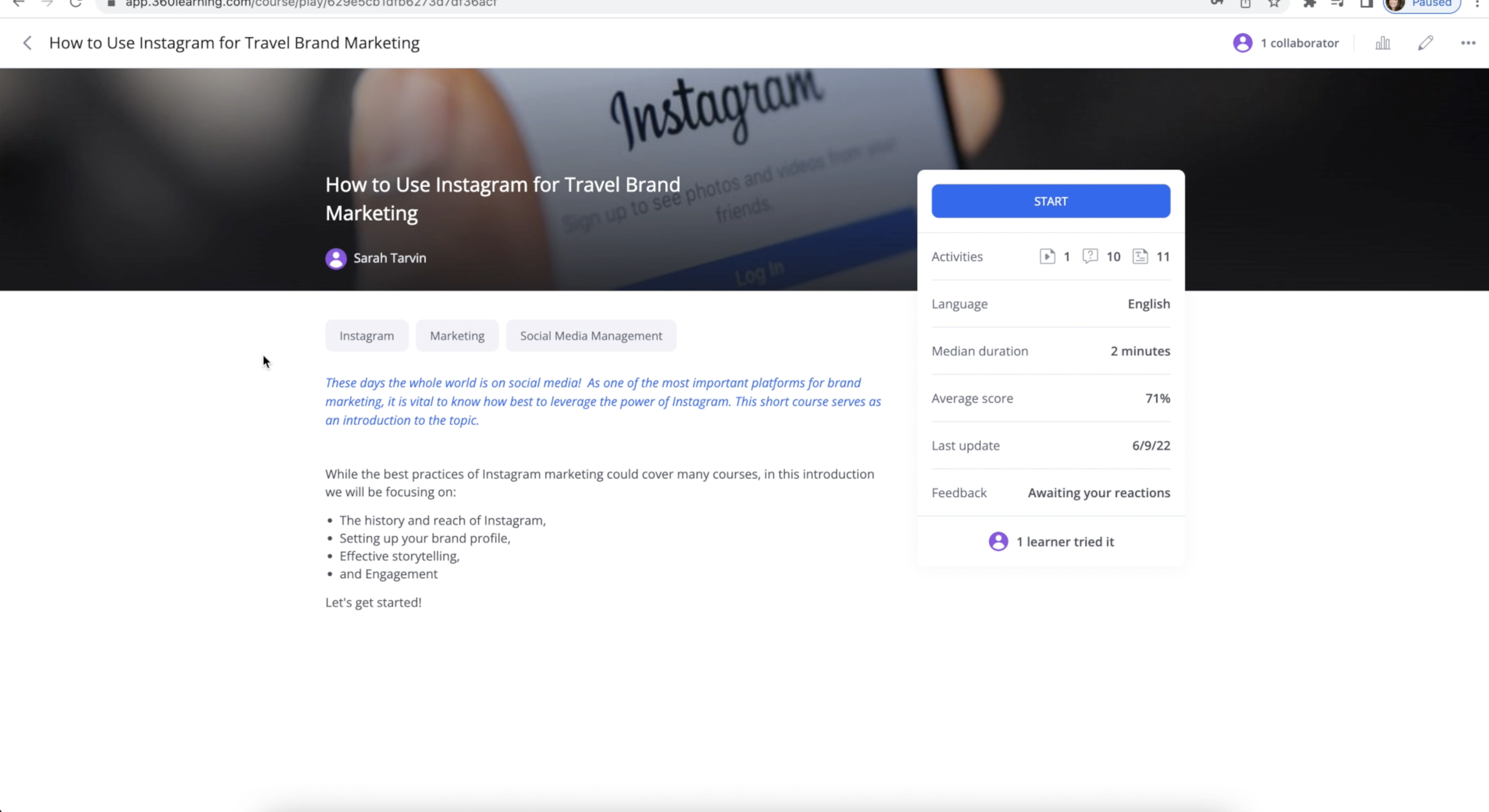 This demo course shows how I used the 360Learning platform to create a course designed to help Home Based Travel Agents use Instagram for marketing.